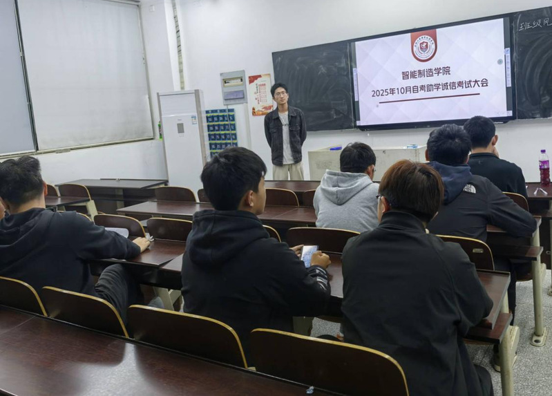 为扎实推进考风考纪建设,引导广大学生以饱满热情和昂扬姿态备战即将到来的2025年10月份高等教育自学考试,智能制造学院于2025年10月24日在机电组团103教室组织召开考前动员暨诚信教育大会。学院继续教育工作负责人陈义刚、各自考本科班主任以及五十余名考生参加本次会议。会议由陈义刚主持。