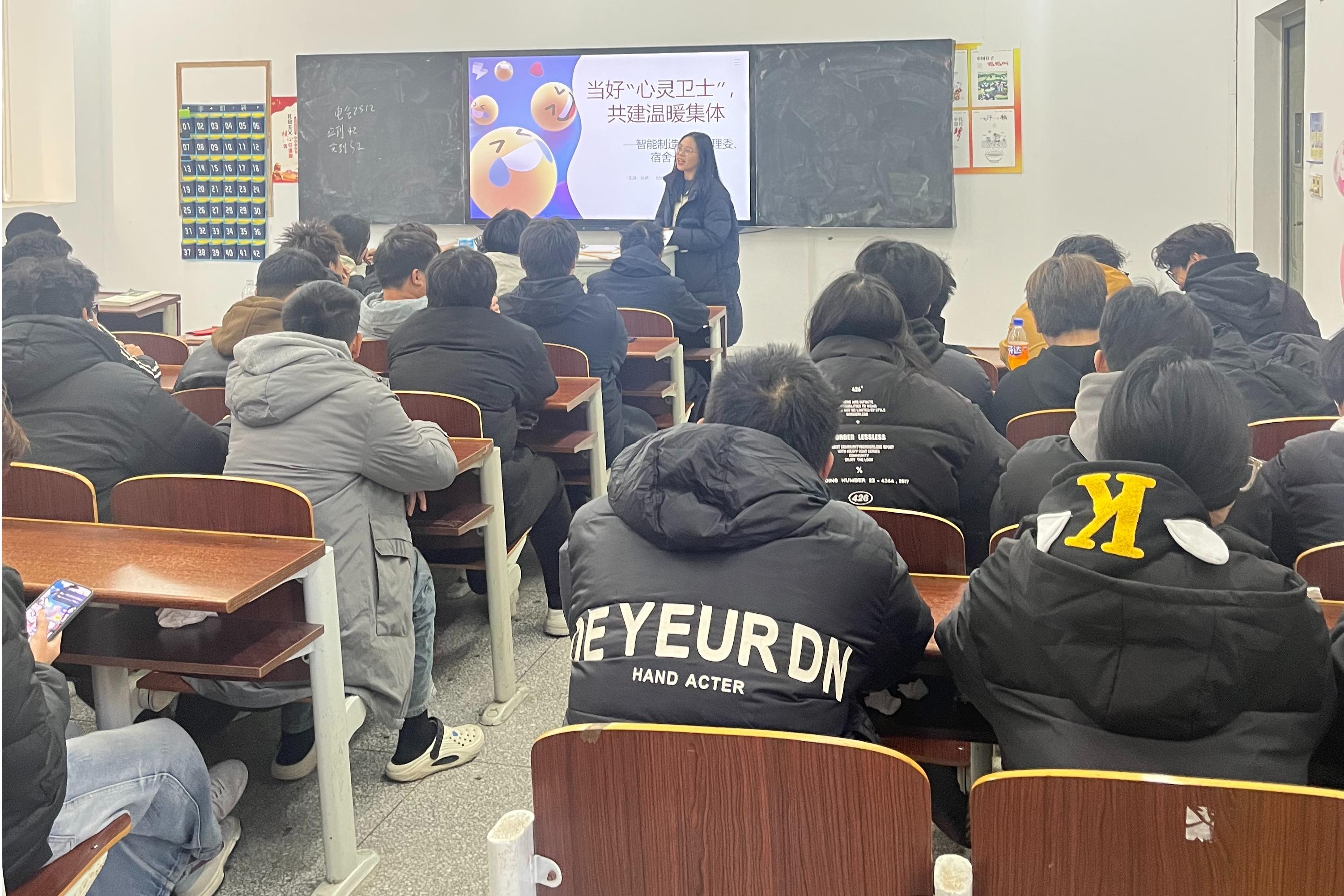 为切实推进心理健康教育工作,进一步筑牢“学校—学院—班级—宿舍”四级心理健康支持体系,促进朋辈互助,12月5日,智能制造学院面向2024级、2025级全体心理委员和宿舍长在机电组团101教室开展了以“当好‘心灵卫士’,共建温暖集体”为主题的心理健康培训会。会议由辅导员徐帆主持。